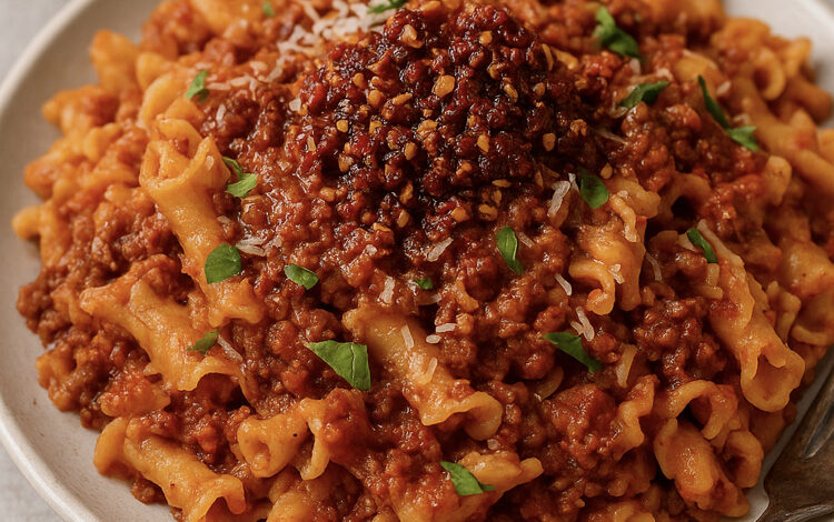 This Campanelle Bolognese with Salsa Macha brings together the comfort of Italian pasta with the bold personality of Mexican chili oil. Every bite delivers warmth, richness, spice, and crunch—a true fusion recipe that feels elevated and memorable.