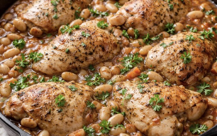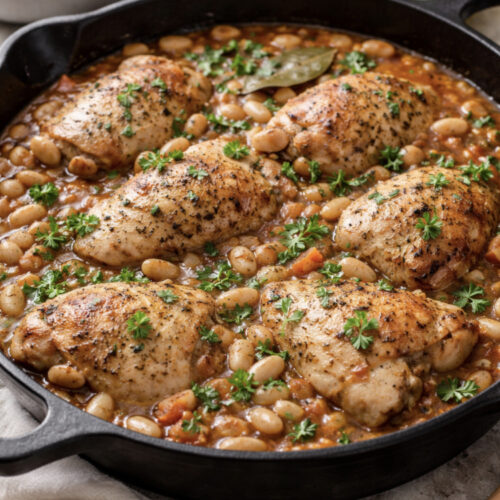 There’s something deeply satisfying about a meal that comes together in a single skillet and fills the kitchen with warm, savory aromas. Skillet Chicken and White Bean Stew is exactly that kind of dish. Tender pieces of chicken simmer gently with creamy white beans, garlic, onions, and herbs, creating a rich yet balanced stew that feels comforting without being heavy.