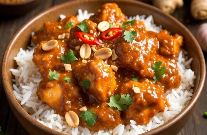Spoon the Satay Chicken over a bed of warm white rice or noodles.